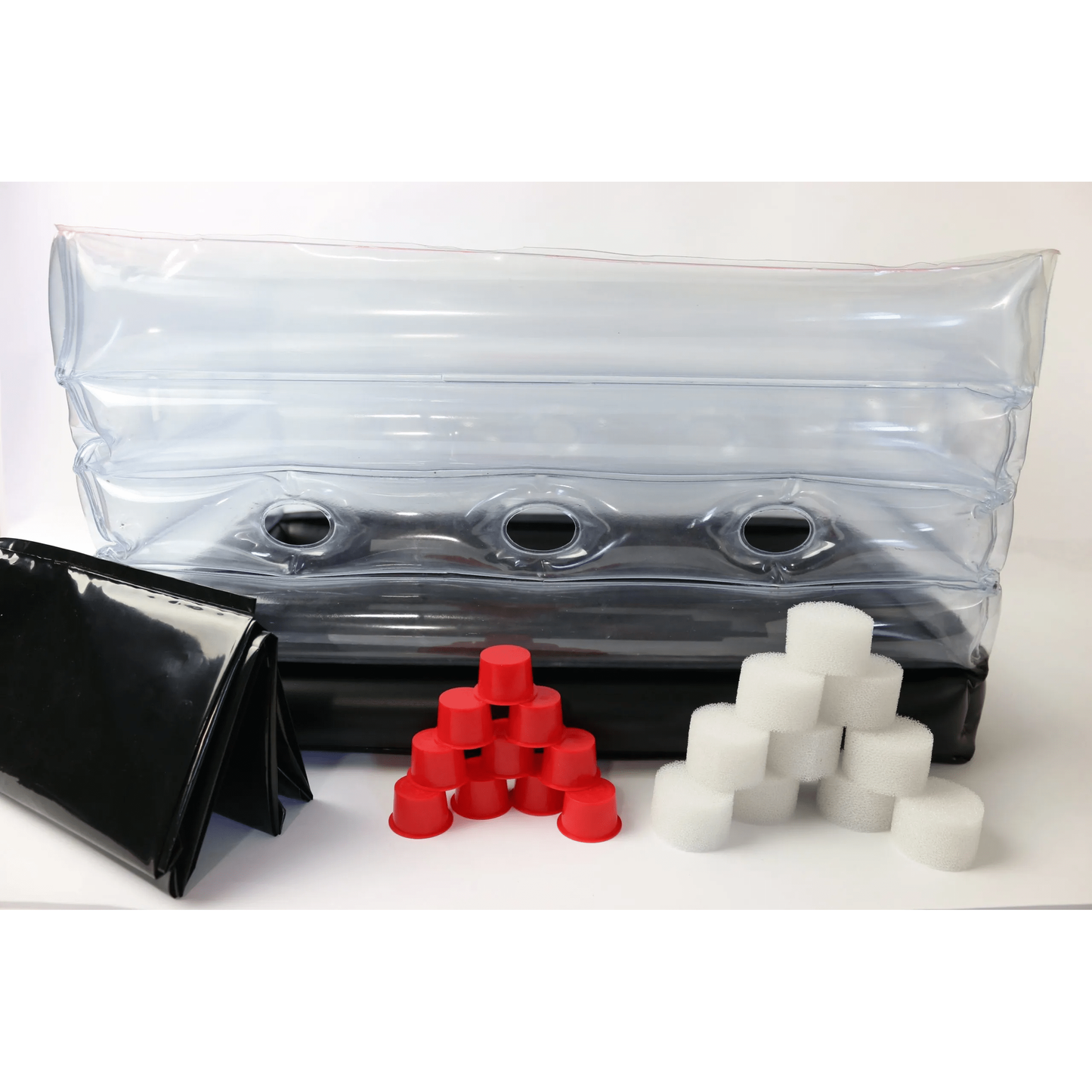 Inflatable Monotub Kit comes with 10 plugs and 10 1-inch filters. Fully inflated is is 19 inches x 11 inches x 11 inches.