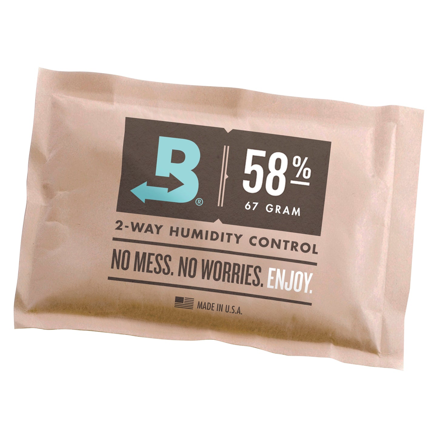 Boveda’s patented 58% humidity control packs regulate moisture content, keeping the contents of your containers at the perfect desired level. They don’t need any activation or maintenance. Just place them in an airtight container with your items and Boveda technology will do the rest. Only Boveda responds to any atmospheric humidity conditions inside a container by adding or absorbing moisture as needed to maintain the predetermined relative humidity (RH) level of 58%. Your material will stay fresh, with stable moisture content, delivering a consistently exquisite experience every time. Lasts 2–4 months depending on conditions. Replace when Boveda turns rigid.