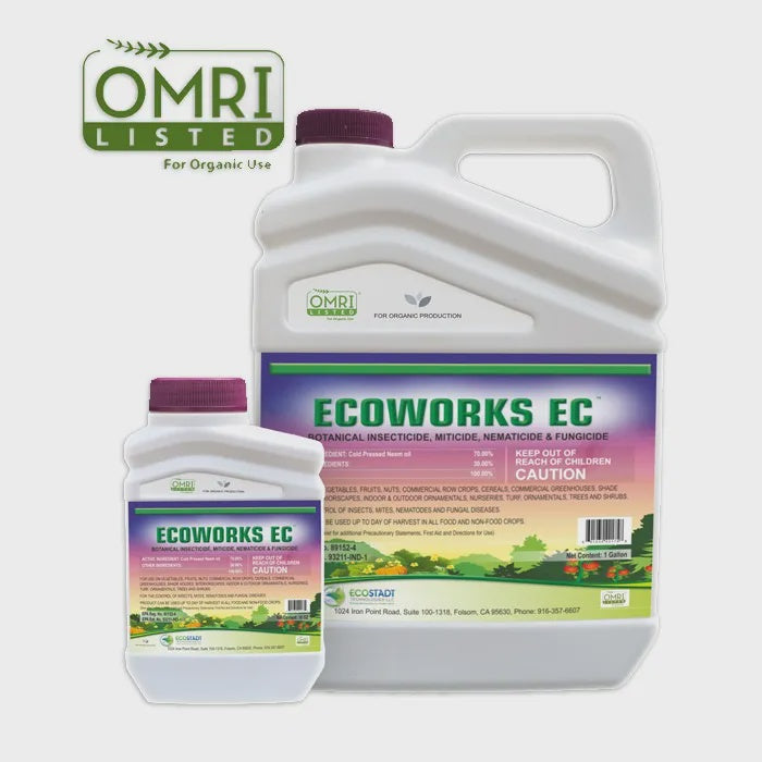 Derived from 100% cold-pressed neem oil, ECOWORKS EC is an OMRI listed pesticide containing azadirachtins, neem limonoids, fatty acids, esters and synergistic inerts for maximized efficacy. Effective against a wide range of biting and sucking insects, soil-borne pests, and several devastating fungal diseases, this is also an exceptional fly repellent. Can be applied as a foliar spray, soil drench, in soilless media or in recirculating systems. This residue-free formulation is EPA registered, UV stabilized to reduce risk of crop burn and has a 0-day PHI. Can be used with beneficial insects.