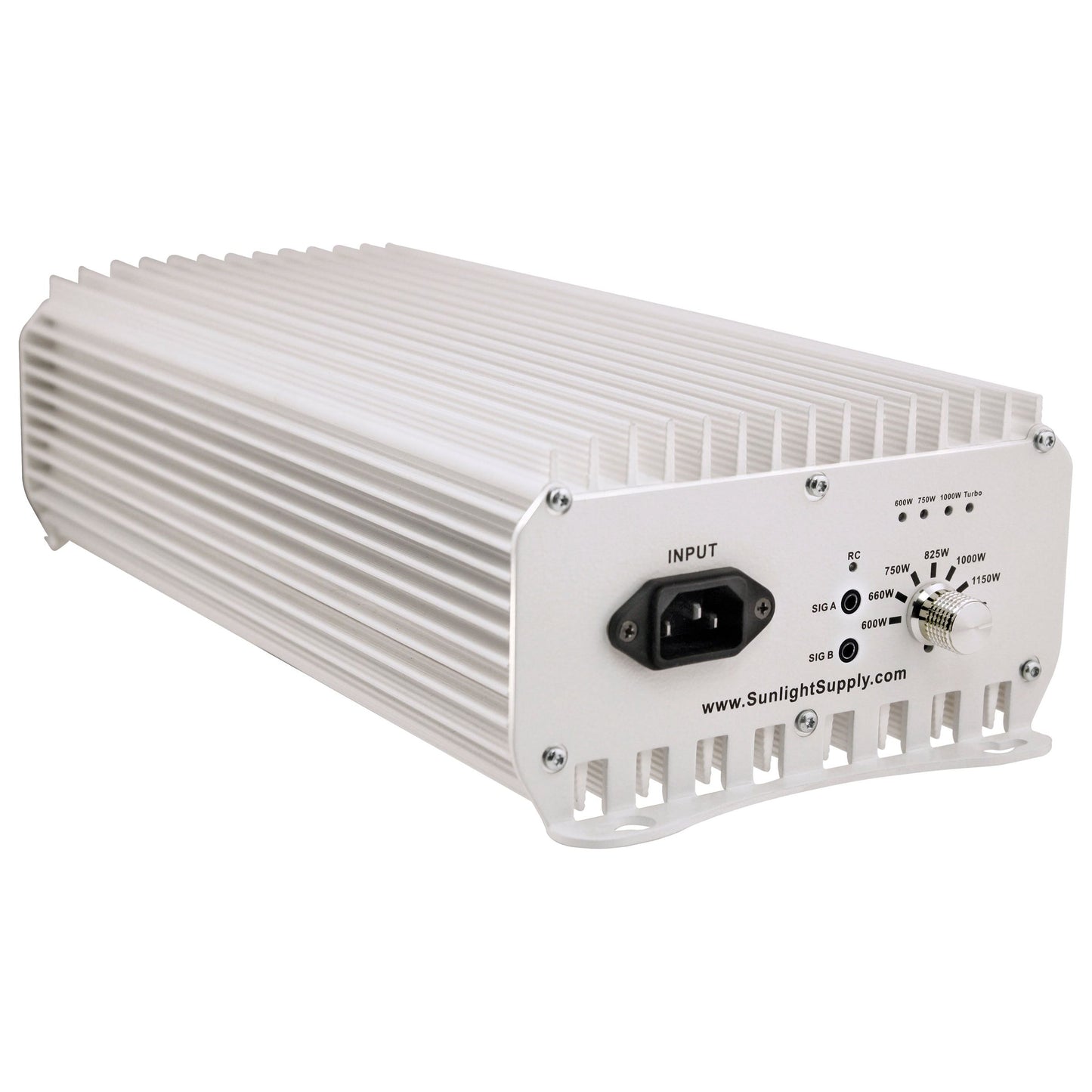 This Sun System 1 ballast has dimmable/selectable wattage, turbo and built-in green LED lights for easily identified self-diagnostic performance codes. Low-current, staggered ignition delay feature eliminates circuit inrush overload and protects lamp for increased lumen maintenance. This ballast includes a prewired lamp cord receptacle that is compatible with all Sun System brand reflectors. A 15 ft Etelligent signal wire and a Convertible Smart Volt Dual Ferrite Power Cord 120-240 volt 6.5 ft with 120 and 240 volt plugs is included. The Sun System 1 Etelligent Controller Kit #902245 (sold separately) allows up to 400 Sun System 1 ballasts to be daisy-chained together. Compliant with both FCC Article 18 Part A (governs commercial use) and FCC Article 18 Part B (governs residential use) as tested by an independent U.S. testing lab in a "true as used" configuration.