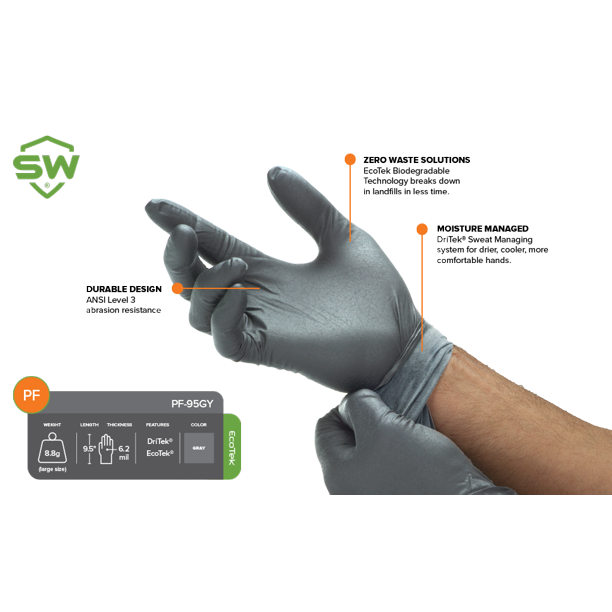 Protect hands—and the environment—with a biodegradable single-use exam glove that combines performance, durability and tactile sensitivity for critical tasks. Black medical grade exam glove. 5.0 MIL thick.